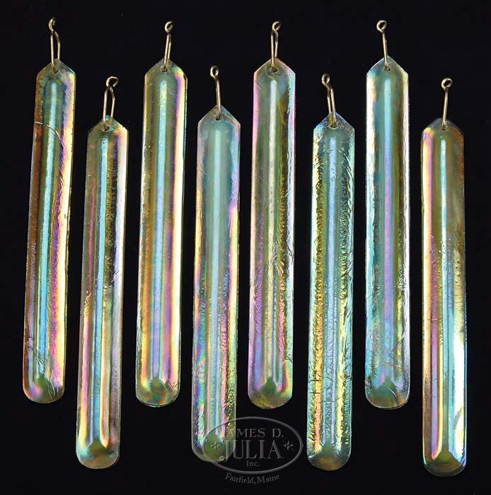 EIGHT IRIDESCENT ART GLASS PRISMS. Beautiful set of eight Tiffany-like prisms have rich gold iridescence with flashes of green and purple. Prisms have a humped ridge running their length with a pointed top and rounded bottom. Each prism is complete with its original brass hook. SIZE: 9-3/4″ l. 11″ l with hook. CONDITION: Very good to excellent with only a few minor chips. 5-66577 (400-600)