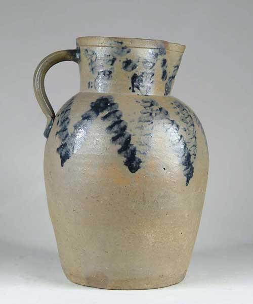 OVERSIZE STONEWARE BLUE DECORATED PITCHER. Zigzag blue decoration on shoulder and neck. SIZE: 13-1/2” h. CONDITION: Very good. 9-99644 (1,000-1,500)