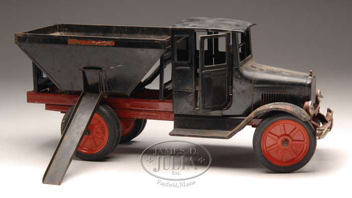 RARE BUDDY L COAL TRUCK WITH OPENING DOORS AND HEADLAMPS. Very scarce truck from old New Hampshire estate. Most of these did not have the opening doors, headlights, and simulated pressed tires. Truck is painted black and has original Buddy L decals and original coal chute. SIZE: 11″ h x 25″ l. CONDITION: Toy is all original and right out of the attic with 20+ years of shelf dust; will clean up fairly nicely. Some rusting and wear to fenders; otherwise very good to excellent condition. 1-7243 MC (1,500-2,500) Auction: Advertising, Toy & Doll - Spring 2007 Please Note: All prices include the hammer price plus the buyer’s premium, which is paid by the buyer as part of the purchase price. The prices noted here after the auction are considered unofficial and do not become official until after the 46th day. |