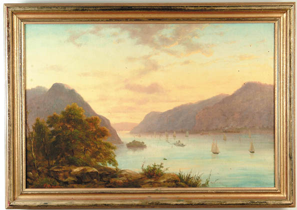 S. CRAMER (American, 19th Century) HUDSON RIVER-TRAIN APPROACHING BREAKNECK MOUNTAIN. Oil on canvas Hudson River scene with side wheeler and several sailboats on the Hudson with tall mountains as banks. Train goes along far bank. Multi-colored sunset from yellow to blue. Signed lower left “S. Cramer”. Housed in a gilt wood replacement frame. SIZE: 24” x 36”. CONDITION: Relined, some inpainting. Good. 9-95368 (2,500-4,000)