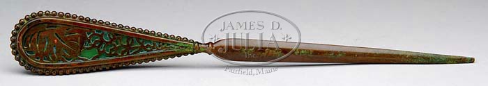 TIFFANY STUDIOS GRAPEVINE PAPER KNIFE. In the desirable patina finish with green backing. Signed on the side of the blade “Tiffany Studios New York”. SIZE: 9-1/4″ l. CONDITION: Very good to excellent. 5-68588 (450-650)