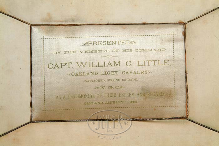 VERY RARE PRESENTATION PAIR OF CASED ENGRAVED SMITH & WESSON NEW MODEL #3 SINGLE ACTION REVOLVERS. Cal. 44 Russian. SN 718 & 5203. Spectacular early revolvers with 6-1/2″ keyhole ribbed bbls with pinned half moon front sights and extraordinary checkered pearl grips. The frames, bbls and cylinders are all beautifully engraved in New York style, probably Nimschke with 75-80% coverage fine foliate arabesque patterns. The cylinders have engraving patterns on the high points with delicate dots, dashes and arrows in the flutes on one revolver and a squiggly line in the other flutes. The bbls, frames and trigger guards are nickel plated while the cylinder and latch on one are gold washed, the other has silver or nickel plating on these parts. The 2-piece pearl grips have checkered diamond patterns around the escutcheons with scallop patterns around the edges of the butt and at the toes with the checkering extending around the bottom of the butt. They are accompanied by their original spectacular rosewood case that has extremely beautiful grain patterns with a 2″ brass shield in the lid engraved with the initials “WCL”. The bottom of the interior is French fitted in purple velvet lining with compartments for the revolvers, a small Dixon oiler, a fine small English style rosewood handled turn screw and an English style wiping rod with ebony shaft, brass tip and ivory handle. The center of the case is a cartridge block which contains 32 rds of original, unmarked, large-primer ammunition. Inside the lid is lined with white satin divided into trapezoidal patterns with a rectangle in the center which is imprinted “PRESENTED / BY THE MEMBERS OF HIS COMMAND / -TO- / CAPT. WILLIAM C. LITTLE / OAKLAND LIGHT CAVALRY / UNATTACHED, SECOND BRIGADE, / -N.G.C. / AS A TESTIMONIAL OF THEIR ESTEEM AND REGARD / OAKLAND, JANUARY 1. 1880”. A brief internet search for Capt. Little and the Oakland Light Cavalry disclosed a small amount of information. It appears that the Oakland Light Cavalry was in existence as early as 1863, and possibly earlier, as there is a mention of Capt. Little of the San Francisco City Guard and the Oakland Light Cavalry being involved with the organizing of a huge party in San Francisco for the visiting Russian fleet on November 17, 1863. There are a number of other references to the Oakland Light Cavalry which will eventually reveal more detail regarding this unit. Accompanied by Smith & Wesson factory letters identifying these revolvers as having been shipped March 1, 1880 to M. W. Robinson, New York City, NY. The letters state that Robinson was Smith & Wesson’s largest distributor and that these revolvers were in a shipment of 60 units in the same configuration, nickel finish and checkered black hard rubber grips. CONDITION: Revolver #718 is fine to very fine, unfired, retaining about 60% original nickel and about 50% original gold wash. The mechanics are crisp with brilliant shiny bore. The grips are crisp with a small stain on the right side and age lines in both sides. Revolver #5203 retains 85-90% original nickel with the cylinder being mostly a gray patina. The grips have a couple small stains, otherwise are crisp and bright with a tiny age line on the right side. It also appears to be unfired with crisp mechanics and brilliant shiny bore. The areas of missing finish on both these revolvers are lightly rusted with a spot or two of heavier rust particularly on the front and back straps. This set was reportedly stored in a basement in a humid climate for many, many years without care or attention. The case is very fine on the exterior with light nicks, scratches and dings and retains about 95% original varnish. The lid lining is yellowed and lightly soiled with a rub from a revolver cylinder. The velvet lining is worn and stained from the humid storage and all the cartridges have oxidized and frozen in the cartridge block. The cartridge block has broken loose from the case. The oiler and turn screw are fine, unfortunately the ebony rod is broken from the ivory handle. This is an extremely rare set that a little care will restore to a much more presentable condition. A little more research on Capt. Little and the Oakland Light Cavalry in the San Francisco area should disclose substantially more information regarding this officer. 4-57533 JR585 (25,000-40,000)