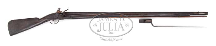 QUEEN ANNE PERIOD ENGLISH MUSKET. SN NSN. 80 Cal. 45-1/2″ long round iron bbl with Gunmakers Company proof marks at left breech directly on top is an engraved numeral 3. No other marks present on gun, lock is held by 3 large head screws contacting the stock directly(no side plate). Bbl tang is held by screw passing through from front of trigger. 8-1/2″ trigger guard is held by a screw in the front and nail in the back. Butt plate covers top half of butt, wraps over and is nailed in 4 places to the stock Wooden rammer is held by 2 ornate thimbles. Includes bayonet with 16-1/2″ flat blade and a straight 3-3/4″ long socket engraved with “40”. CONDITION: Metal is generally in very good condition showing its age. Wood is generally sound with only minor scrapes. 4-35208 PAS15 (4,000-7,000)