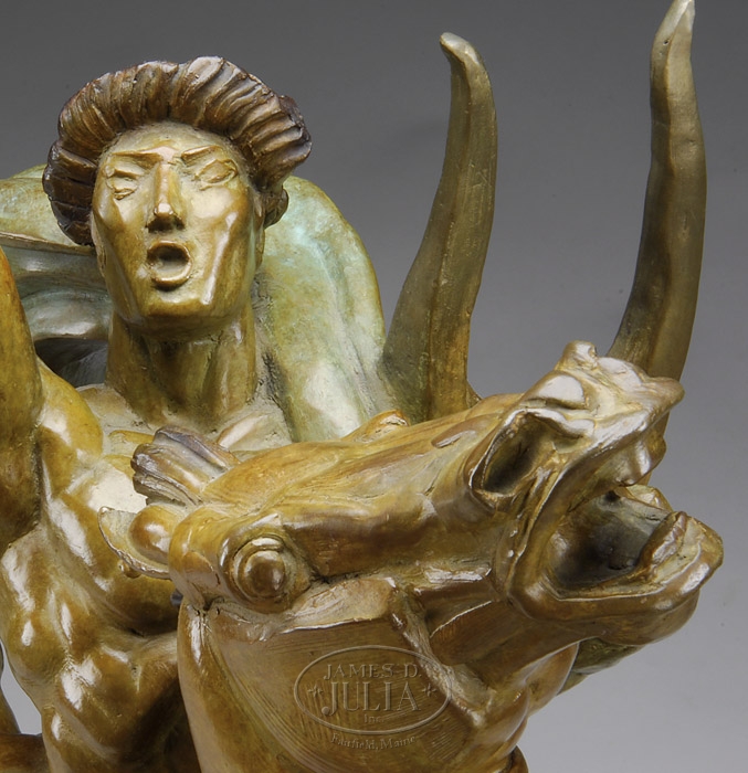 ALBERT W. WEIN (AMERICAN, 1915-1991) “SONG OF APOLLO”. The large verdigris and patinated bronze statue depicting a nude male with cape and winged helmet, mounted on a stallion, both looking skyward, the rider with right arm extended upward. The statue is modeled with accentuated details and musculature. The horse, standing on a stylized cloud and mounted on a stepped plinth with concave molded base. The signature and marks on the lower corner of the plinth and again on the concave base at the corner: “WEIN ’89 1/12 (C) 1989”. Bottom plinth stamped “CRF” on corner. Statue, plinth, and base all appear to be as one. SIZE: 41-1/2″ h x 21-3/4″ l x 13″ w. CONDITION: The richly colored surfaces in very fine condition, with no defects or imperfections noted. 9-92716 (75,000-125,000)