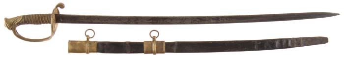 CIVIL WAR U.S. MODEL 1850 FOOT OFFICER’S SWORD. A basic example of this common Civil War sword. This example was manufactured by C. Roby who also had contracts with the Federal Government for cavalry sabers and other equipage. The lightly curved blade measures 31.5” long and is profusely etched over 60% of the blade’s surface. The etching includes patriotic motifs, scrollwork, an spread winged eagle and “US.”. The etching is deep and typical of this manufacturer. Near the ricasso is the manufacturer’s name: “C. Roby/Chelmsford, Mass.”. The hilt conforms to the regulation, being half-basket style with scrollwork counterguard and decorative pommel cap. The grip is of wood, covered in sharkskin and wrapped with twisted brass wire. The scabbard is of black bridle leather sewn on the back with brass furniture. CONDITION: Fair. Blade is cleaned but shows light pitting overall even though the deep etching remains visible. Scabbard is stiff showing some light flexing. Brass drag is missing. 4-30884 (1,000-1,500)