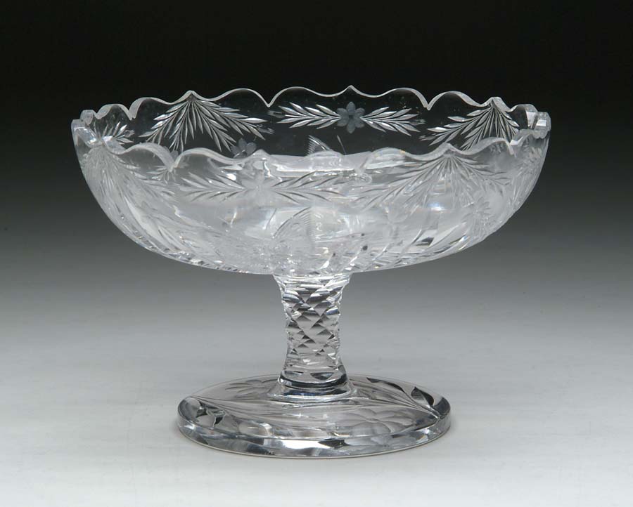 PAIRPOINT CUT GLASS COMPOTE. Large Pairpoint compote cut in garland pattern with intaglio cut leaves, flowers and butterflies. Foot is also cut with flowers and leaves. SIZE: 9 in. dia x 6 in. t. CONDITION: Very good to excellent. Estate of Edwin Schiebel Sr. 5-60201 (100-200)