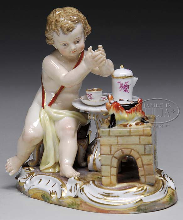 MEISSEN FIGURAL GROUP OF YOUNG CHILD. Mid 19th-first quarter 20th century, German. Depicting young child at table with cup of hot chocolate seated on a footstool by an outdoor stove on scrolling plinth. Incised “C. 97.” next to impressed mark “143”. With double swords in underglaze blue. SIZE: 4-1/4″ h. PROVENANCE: From a fine New Jersey home. CONDITION: Child missing middle finger right hand, missing elements top of pot on stove. Otherwise very good. 9-24526 (500-800)