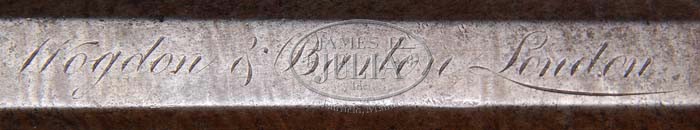 CASED PAIR OF WOGDON & BARTON FLINTLOCK PISTOLS. SN NSN. Cal. 56. Fine pair of pistols with 10″ swamped oct bbls with tiny front sights & fixed rear sights on breech plug tangs. Top flats are marked “Wogdon & Barton London”. They have front action locks with sliding safeties, roller, bridled frizzens with humps in frizzen springs. Frizzen springs have swelled ends with short teats. Lockplates are straight with beveled edges, stepped tails & short teats with aforementioned sliding safeties. Hammers have graceful goosenecks with decorative beveled edges & engraved screws. They have scalloped, gold-lined pans & gold flash holes. There is a wide gold band at breech end of bbls with engraved borders. Breech plugs are beautifully engraved with small trophy of arms & engraved screw heads. They are mounted in smooth, 1-pc, walnut, full length stocks with two wedges through German silver escutcheons. They have raised side panels with flat sided bag shaped grips and are mounted with silver plated iron furniture consisting of single guides with a decorative nose pipe. Trigger guards are nicely tapered with foliate & floral engraving & elaborately engraved pineapple finials. One has its orig horn tipped rammer & the other has what is probably its orig rammer with a tapered steel tip on one end and a worm on the other. A truly fine early set. Accompanied by a walnut casing with green baize lining, compartmented in bottom for pistols, an ebony, steel & brass cleaning rod, a nutcracker style ball mold with sprue cutter marked “28” and a small brass powder flask. Corner compartments are empty with one cover missing & the other a replacement. CONDITION: Pistols remain in very good to fine condition with bbls retaining 85-90% orig brown Damascus pattern. Lockplates & hammers are a smooth dark gray patina with one hammer neck broken & repaired. Stocks are sound with minor, light handling & use marks with one small gouge on one pistol & both retain a smooth hand worn patina. Mechanics are fine, smooth even bores with a few spots of pitting. Case has a couple of grain checks in lid with some shrinkage at front corners and a crack & bug damage in bottom, otherwise is sound with handling & storage nicks, scratches & dings and retains most of an old restored finish. Interior is faded & soiled with worm & moth damage but reasonably intact. Center partition has been amateurishly repaired & maker’s label is missing. 4-33803 JR399 (3,000-5,000)