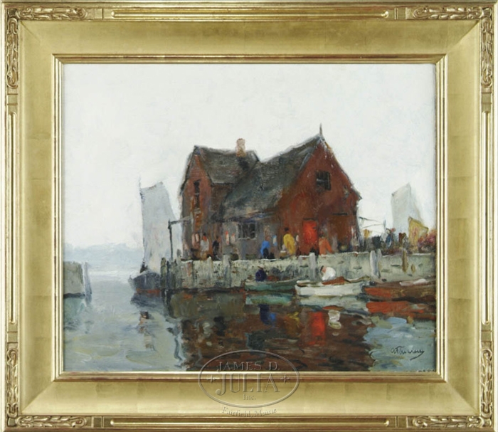 ANTHONY THIEME (American, 1888-1954) MOTIF #1, ROCKPORT, MA. Oil on canvas Rockport Harbor scene shows the connected red building at the end of a wharf in Rockport Harbor. Several people are seen on the dock with two in small rowboats. A sailboat is moored at end of the dock. Signed on right bottom corner “A. Thieme”. Housed in a fine arts and craft style carved gilt wide frame stamped “Guido Frame Studios”. SIZE: 25” x 30”. CONDITION: Relined, some inpainting. Very good. 9-28449 (35000-45000)
