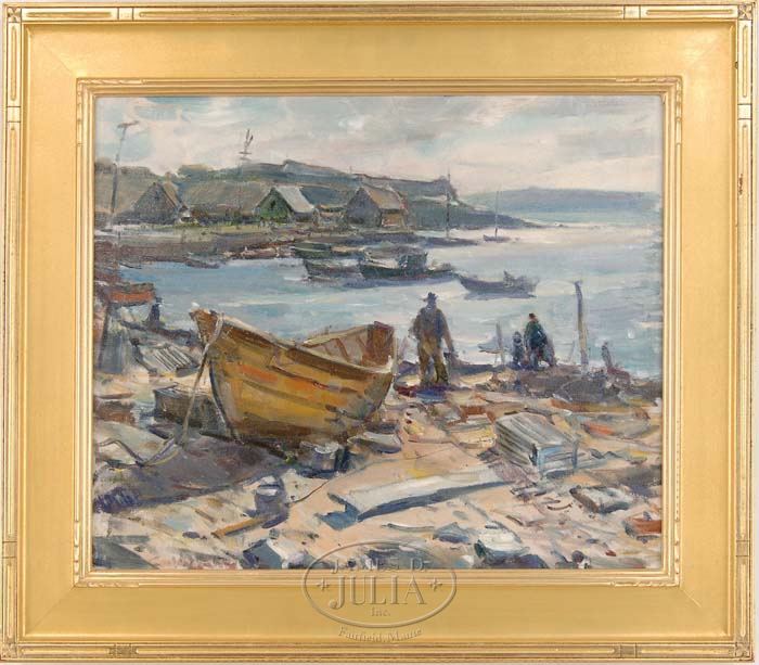 CARL WILLIAM PETERS (American, 1897-1980) “PREPARING THE TRAPS. Oil on canvas scene shows three lobstermen at edge of harbor tending to their lobster traps and boats. Beyond the tranquil small harbor are fishing shacks, boats and low hills. Signed lower left “Carl W Peters”. Housed in a fine reproduction arts and crafts style gilt frame. Reverse has a number of exhibition labels including R. H. Love Galleries, Chicago; Hunter Museum of Art; and Butler Institute of American Art. SIZE: 20” x 24”. CONDITION: Very good. 9-70935 (10,000-15,000)