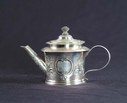 MINIATURE ENGLISH SILVER TEAPOT. Hallmarks to base London, 1727. “J. G” (James Goodwin). Separate slightly domed cover has small wood turned finial. Teapot has scroll flat handle, angled spout water can shaped with flower and sea scroll decoration. Two solder marks to bottom of base. WEIGHT: 5 tr. oz. SIZE: 4” h. CONDITION: Generally very good. 12-5 (800-1,200)