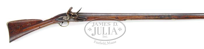 FINE T. HENSHAW BRITISH FLINTLOCK FOWLER. Cal. About 8 bore. Scarce early British fowler with 60″ swamped rnd bbl, 75-1/2″ overall with beautiful gold demon face front sight. It has an early Brown Bess style lockplate about 7″ long, slightly curved with a long teat and rounded gooseneck hammer with bridled frizzen & maker’s name in front of hammer. Mounted in what appears to be a 1-pc walnut stock with four keys and brass furniture. Bottom of forestock has three brass guides containing a horn tipped, very old replacement wood ramrod & a small Brown Bess style nosepipe with a large brass sideplate that has light engraving patterns. Stock has raised side panels with raised carved decorative leaf pattern around top tang and an early Brown Bess style buttstock with large acorn shaped thumbplate and smooth buttplate with 3-stepped tang. Both sides of butt & bottom of stock are branded in a total of six places “IL”. Trigger guard is smooth & plain with a worn pineapple finial & a break through the tang screw. Left top flat of bbl has three British proofs. This is a fine example of a late 1700’s British fowler. CONDITION: Good to very good. Bbl retains an even cleaned silver/brown patina with fine pitting over most of surfaces. Lockplate & hammer are a smooth cleaned patina with some fine surface rust. Stock has a crack & a break on bottom in front of trigger guard with some repaired damage & small slivers missing from forestock. Overall retains a medium dark hand worn patina. Mechanics are fine, dark bore. 4-35995 JR515 (10,000-15,000)