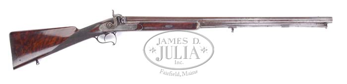 HIGH QUALITY EIGHT BORE FRENCH SINGLE BARREL SHOTGUN BY BERNARD. Eight bore. 31″ octagon to round Damascus bbl signed in gold “Canons de E. Bernard”. Stock is held to bbl with one bbl wedge and has sharp checkering at the wrist. Iron trigger guard and buttplate are not engraved and there are no marking or engravings on percussion lock. Gun is equipped with sling swivels. The Bernard family were French gun barrel makers since 1797. This gun is equipped with a spring loaded bayonet lug at the muzzle end of the bbl. PROVENANCE: Dr. Frank Miller Estate Coll. CONDITION: Bbl is exceptionally clean, Damascus is nicely figured and gun is in better than average condition throughout. 4-35727 RGG25 (2,500-4,500)
