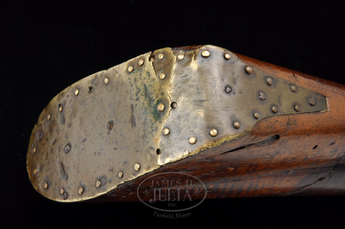 FRENCH EARLY 18TH CENTURY SHORTENED WALL GUN. SN NSN. 90 Cal smooth bore. 32-3/8″ long bbl round for the forward 19-1/2″, the balance at the breech being octagon, measuring 1-3/4″ across the breech. Mounted at the muzzle is a 1-3/4″diameter by 1″ long bell shaped reinforcing collar that covers the muzzle for 1″ of the muzzles length. The 1728 French lock is marked “SE” with a Fleur de lies over the makers name “Girard” . Trigger guard and side plate are iron . Butt plate is sheet brass nailed to the butt stock nailed with more than 30 brass tacks. There are two iron bands located 5″ and 10″ respectively behind the muzzle. Additionally there is a brass stock band located 12″ behind the muzzle to guide the original rammer in the channel. The exact purpose of this gun is unknown but appears to be a wall gun that may have end of the bbl burst at one time and was reinforced with the brass collar and put back into use at a frontier outpost. CONDITION: Metal shows an even aged patina with no serious heavy pitting. Wood shows its age as well with some worm damage and a 3″ long stress crack on right side of butt not affecting soundness 4-35996 PAS52 (1,200-2,000)