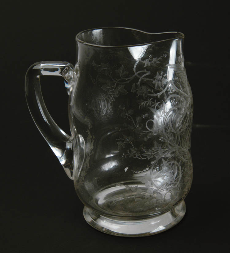 COPPER WHEELCARVED PITCHER. Elaborately carved pitcher features design of twining grapevines interspersed with birds, lizards and a Pegasus type horse. Beautifully detail carving also features grapevine circling the bottom of the applied glass handle. Vine also climbs onto the handle itsel.06 In the center of the carvings is a stylized carved “T”. Etched on the bottom “Rd 75175”. SIZE: 6 3/4″ tall. CONDITION: Very good to excellent. 5-67820 (300-500)