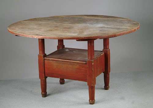 TWO PART ROUND CHAIR TABLE IN RED PAINT WITH SCRUB TOP. Four board top has nice weathered surface. Base has lift top compartment with turned legs and turned arms. SIZE: Top is 49-1/2” dia. x 29” h. CONDITION: Generally very good. 9-97998 (2,000-4,000)