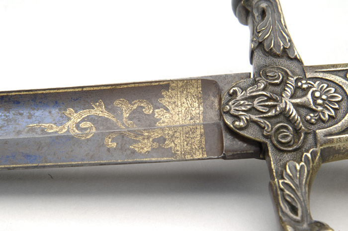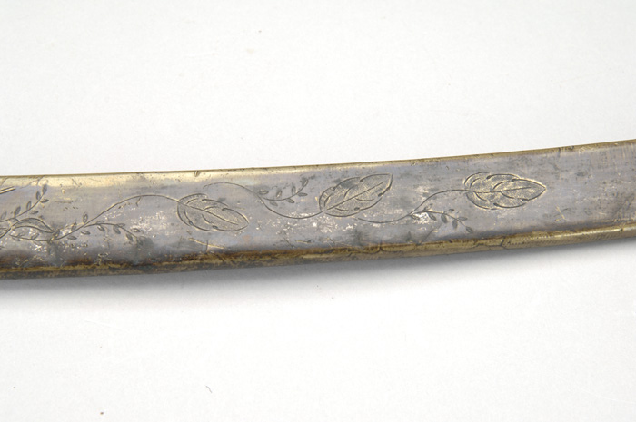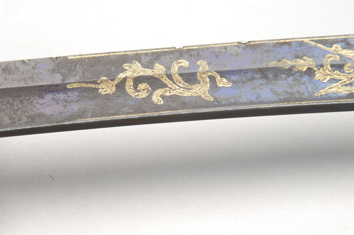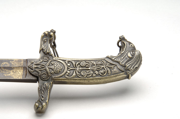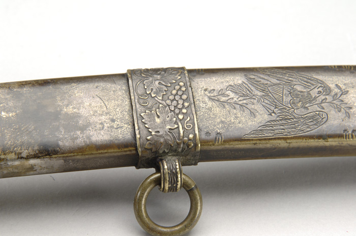 WIDMANN EAGLE HEAD OFFICER’S SWORD. Though unmarked this is a classic example of a Philadelphia made Widmann eagle head with 31-1/2” blue & gold decorated blade with military motifs including flags, cannon and panoply of arms. This hilt is solid cast with floral decorations terminated in an eagle’s head pommel. Brass scabbard decorated in classic Widmann-style with grape leaf decorated ring mounts. Engraved on scabbard is a foliate U.S. and an American eagle and also a large panel with a cannon over a flag. CONDITION: Gold decoration on blade is 70% intact. blued background on blade is visible only in traces. Cutting edge has numerous nicks. Blade is slightly loose from hilt. Scabbard fits poorly. Hilt retains no plating but retains patina in protected areas. Scabbard retains 20% orig silver plating. Scabbard has several bends and scuffs. 4-30064 JS33 (3,000-4,000)