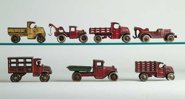 LOT OF 7 SMALL C.I. TRUCKS 1) Mack High Stake body truck (Good). 2) Arcade dump body truck (Good). 3) Mack closed body delivery truck (Fair to Good). 4) Mack open bed truck (Good). 5) Mack low rail stake body truck (Good). 6) Roadster style tow truck, WRT. (Good) 7) Model A style small tow truck (Good to very good). SIZE: Longest is 6″. 1-261-478 (350-600) Auction: Advertising, Toy & Doll - Spring 2003 Please Note: All prices include the hammer price plus the buyer’s premium, which is paid by the buyer as part of the purchase price. The prices noted here after the auction are considered unofficial and do not become official until after the 46th day. |