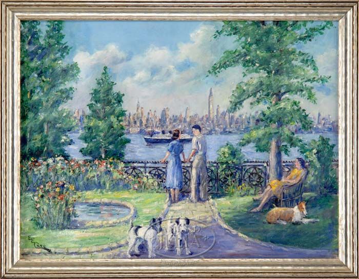 EDMUND ELISHA CASE (American, 1844-1919) NEW YORK CITY SKYLINE. Oil on canvas scene shows a couple standing by a fancy iron fence in garden setting looking across to the skyline of New York City with an ocean liner on the water between. Signed lower left “E. E. Case”. Housed in a silver gilt molded wood frame. SIZE: 18” x 24”. CONDITION: Very good. 9-90267 SM (800-1,000)