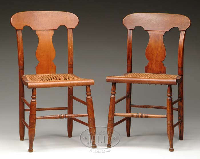 PAIR OF CANE SEAT VASE-BACK CHAIRS. Turned legs with front turned stretcher, rounded edge seat rail, curved vase styled backsplat. Remnants on one of original grain painting. PROVENANCE: From an Augusta, Maine home. SIZE: 33” h x 17-1/2” w x 18” seat h. CONDITION: One seat cane needs repair, otherwise good. 9-70082 (75-125)