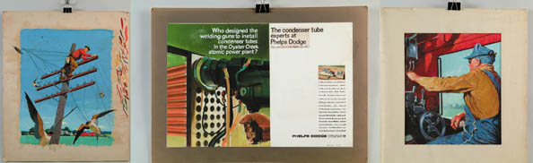 EVERETT STOUTENBURGH WARD (American, 1911-1994) THREE ILLUSTRATIONS. 1) 18” x 14” unsigned oil on board illustration showing lineman servicing a utility pole with swallows and large farm beyond. Unframed. A nice colorful illustration. CONDITION: Surface grime. Very good. 2) 11” x 9-1/2” unsigned oil on board illustration showing an engineer operating a train. Unframed. A nice colorful illustration. CONDITION: Very good. 3) 12” x 17-1/2” unsigned collage advertisement design for Phelps Dodge “involving condenser tubes in the Oyster Creek atomic power plant”. Dated 8/3/66. CONDITION: Good. PROVENANCE: All from the artist’s family. 9-94518 (200-400)