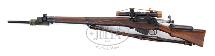 *NUMBER IV MARK I (T) BRITISH SNIPER RIFLE. SN S39516. Cal. 303. These sniper versions of the Mark I were fitted with scope mounts on the left side of the receiver. Many of these rifles were converted by Holland & Holland and used various telescopes. This one is fitted with a Number 32 telescope. Rifle is also equipped with a spike bayonet and web frog as well as a leather sling with brass keepers. Also includes very nice British web scope case and transit chest. PROVENANCE: Stern Collection. CONDITION: Receiver retains approximately 95% of a possible re-finish dark gray Parkerizing as does the matching scope mount. Telescope is a number 32, showing better than 95% of orig enamel with crystal clear optics that show nearly new. It also has a red “W” and blue “B” painted on the sides. Scope caps are also excellent. Bbl shows better than 95% orig blue with just slight markings from having the bayonet taken on and off. Front sight and bands show better than 95% orig finish. Upper handguards are in exceptional condition with one or two very slight bruises in the front one. Lower guards, which are matching number to gun, are also in magnificent shape showing very little marks at all. Triggerguard and magazine assembly show better than 90% orig black matte finish. Buttstock and cheekpiece are in excellent condition (though not matching) with just a minimal of bruising as is the brass buttplate. A very nice Number IV sniper rifle with crisp action and excellent bright and shiny bore. 4-34081 BK124 (3,300-4,550)