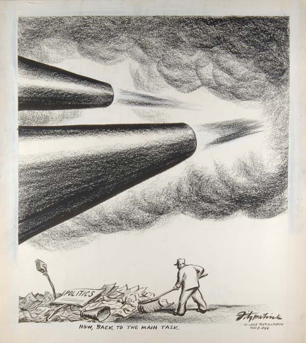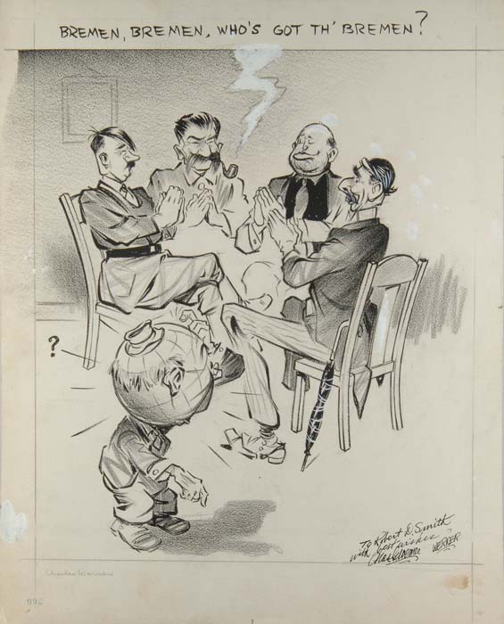 THE ROBERT D. SMITH COLLECTION OF ORIGINAL, EDITORIAL/POLITICAL CARTOONS FROM THE 1940s. This fabulous collection was amassed during the war years by Mr. Robert D. Smith of Bangor, Maine. He would write a particular artist requesting an example of their original work and in many cases Mr. Smith would receive a letter accompanied by an original work. Some are inscribed to Mr. Smith, and some are accompanied by the original letter, or the newspaper in which the artwork was published. Artists include: G.Brown, Edmund Gale, Charles Werner, Vaughn Richard Shoemaker(2), Cy Hungerford, Reg. Manning, Bruce Russell (2), Cecil Jensen, Harry Bressler, Bill Warren, Paul Garmack, R.A. Lewis, Fred O. Scibel (2), S.J.Ray, Bill Geagan, TH. Burbank, Vic Runtz, Ed Marcus (2), Will B. Johnstone, Daniel Bishop, Loring Brown (2), Gene Elderman, Fitzpatrick and more. PROVENANCE: From a Bangor, Maine estate. SIZE: Sizes vary with largest measuring 20” x 17”. CONDITION: Generally very good. 9-72742 (2,000-4,000)