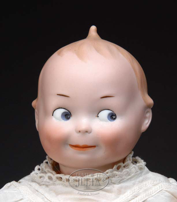 UNUSUAL 15″, (38 CM) ARMAND MARSEILLES GOOGLIE. Kewpie-like Googlie with molded and painted features, with head incised “G.B. 252. GERMANY A.0.M. D.R.M.R.” with painted intaglio blue side-glancing eyes, white enameled eyes, with heavy black upper eye liner, one stroke eyebrows, watermelon-type smiling mouth with defined upper lip, tufts of hair above each ear, and pointed top knot in center of head. She is on a five-piece toddler body, and wears a period white cotton and lace baby dress with newer shoes and socks. CONDITION: Head is free of damage, body finish original, body likely an old replacement as it is disproportionately long. 1-7297 RS (1,000-1,500) Auction: Advertising, Toy & Doll - Spring 2007 Please Note: All prices include the hammer price plus the buyer’s premium, which is paid by the buyer as part of the purchase price. The prices noted here after the auction are considered unofficial and do not become official until after the 46th day. |