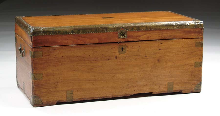 ANTIQUE LIFT TOP CAMPHOR WOOD CHEST. Brass side swing handles, brass bound top. SIZE: 15” h x 36” w x 18” d. CONDITION: Fair. Front lid has warping. Dents to brass, cracks in base. 9-26072 (200-300)