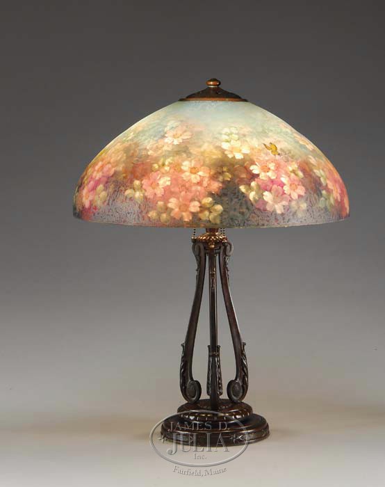 HANDEL 6688 FLORAL & BUTTERFLY TABLE LAMP. Outstanding reverse painted shade begins with a beautiful floral pattern that encompasses two-thirds of the shade. This floral pattern is painted in colors of lavender, amethyst, aquamarine, blue and green. This pattern is set against a beautiful sky blue background. Three butterflies further accent this decoration in vibrant orange, yellow and blue. The shade is supported by a three socket base with three Art Nouveau scroll legs resting on a double pedestal foot. Shade is signed on the interior rim “Handel 6688”. Base is signed on underside with “Handel Lamps” cloth label. SIZE: Shade is 18″ dia. Overall 23″ t. CONDITION: Very good to excellent. 5-68219 (10,000-15,000)