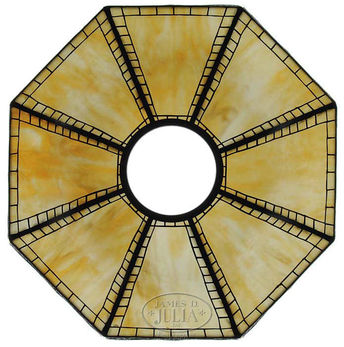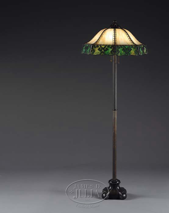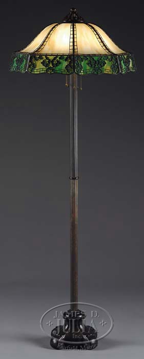 HANDEL METAL OVERLAY FLOOR LAMP. Outstanding Handel floor lamp has caramel slag double bent panels that are connected with typical Handel ladder work overlay. The shade skirt has Ginko pattern with green slag glass behind and green obverse painting within the Ginko leaves. The shade rests on a classic Handel floor base with bulbous foot, vertically ribbed stem, five light cluster and openwork fleur de lis cap. Shade is signed with “Handel” tag. Base is signed on side of foot with impressed block letters “Handel”. SIZE: Shade is 24″ dia. Overall 66″ t. CONDITION: Very good to excellent with some minor discoloration and wear to patina. 5-68980 (7,000-9,000)