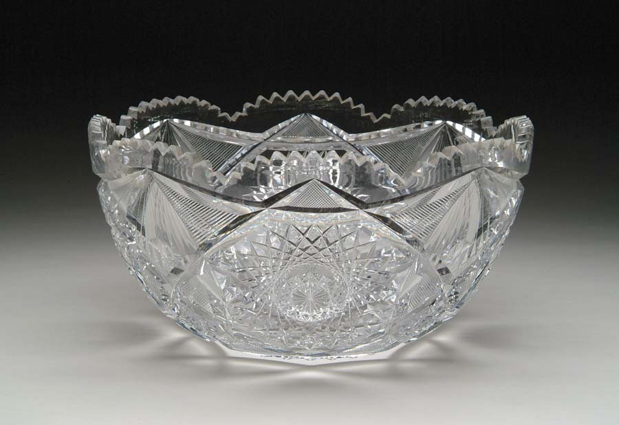 CUT GLASS PUNCHBOWL. Punchbowl is cut in hobstar, fan and crosshatching pattern. Signed “Strause” (star in circle). SIZE: 13 in. dia x 7″ in. t. CONDITION: Minor edge roughness, otherwise very good. Estate of Edwin Schiebel Sr. 5-60063 (700-1,000)