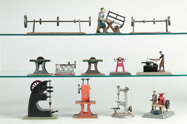 LOT OF 12 STEAM DRIVEN TOYS Germany. An interesting group of animated steam driven toys depicting factory/machine shop equipment. Mfg. by Linemar, Weeden, Fleischmann, Bing and others. Lot includes table grinder, figure hammering at anvil, drill press, two interim line shaft pulley sets, table saw, an interesting figure operated food processor, an early Bing drilling machine, twin wheeled bench grinder, figure operating wood saw, triple hammer planishing machine and a double hammer tapping machine. SIZE: Tallest is 6″. CONDITION: Averaging good to very good with all toys working. 1-268-491 (300-500) Auction: Advertising, Toy & Doll - Spring 2003 Please Note: All prices include the hammer price plus the buyer’s premium, which is paid by the buyer as part of the purchase price. The prices noted here after the auction are considered unofficial and do not become official until after the 46th day. |