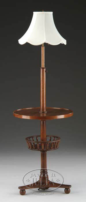 ENGLISH STYLE WALNUT LAMP STAND. Adjustable, central post supporting a round dish top tier below which is a spindled basket, all supported by a tri-foil base ending in ball feet. The top fitted with two light sockets and a silk shade. SIZE: 60” at center of adjustment x 20” dia. at widest 9-74084 (350-600)