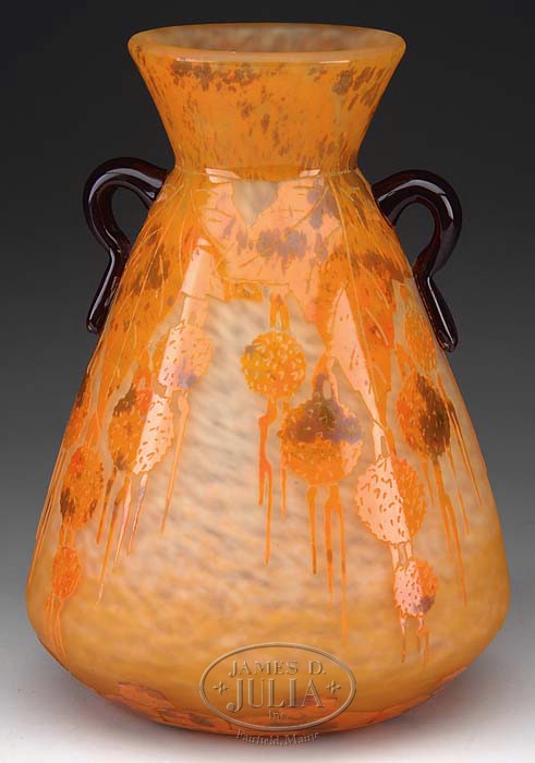 LE VERRE FRANCAIS CAMEO VASE. In the Platanes pattern with very pretty orange and cocoa pendulous fruit and leaves on a mottled and shaded maize to tangerine background. With two applied deep purple handles. Signed in cameo “Charder” on the side of the vase as well as etched “Le Verre Francais” on the foot rim and acid etched “FRANCE” on the underside, together with the original retailer’s label from a store in France. SIZE: 10” t. CONDITION: Very good to excellent with two small chips to the underside of the vase. 5-68533 (3,000-5,000)