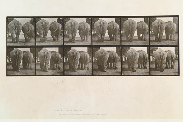 EADWEARD MUYBRIDGE (1830-1904) ANIMAL LOCOMOTION PLATE 735. Photographic print shows two rows of six still photographs in series. Scene shows two elephants walking away from viewer. SIZE: 19” x 24”. CONDITION: Good. 9-94639 (400-600)