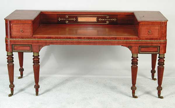 FINE SHERATON MELODEON-STYLE MAHOGANY DESK BY JOHN BROADWOOD & SONS, LONDON. Top section with large recessed writing surface having back plate with brass inlay and inset name plate. Each side has two drawers, all resting on six well-carved and ring turned legs ending in castor feet. Ormolu trim and good band edge inlay. SIZE: 33 1/2″ x 6″w x 25″d. CONDITION: Generally good. 9-92048 (1,250-1,500)