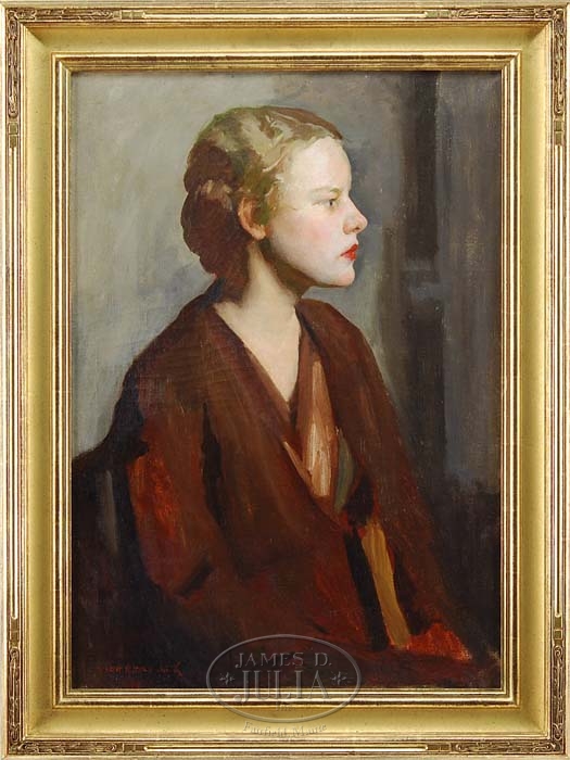 BEULAH SELESNICK (American, First half of the 20th Century)PORTRAIT OF A WOMAN. Oil on canvas Boston School portrait shows a seated woman in side view against a grayish background. Signed lower left. Inscribed on back of canvas with artist and address. Housed in a fine carved and gilt reproduction frame from Guido Frame Studio. SIZE: 30-1/4″ x 21″. CONDITION: Some minor inpainting, craquelure, very good. 9-91245 (3,000-5,000)