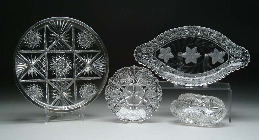 FOUR CUT GLASS ITEMS. 1) Serving tray cut in hobstar and fan pattern with a silver rim. SIZE: 12 in. dia. 2) Intaglio cut floral pattern ice cream platter. SIZE: 14-1/4 in. l. 3) A 7 in. dia. dish cut in hobstar pattern. 4) 6-3/4 in. dish cut in hobstar and fan pattern. CONDITION: Three of the items have edge roughness, the tray is very good to excellent. Estate of Edwin Schiebel Sr. 5-60115 (100-200)