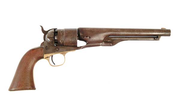 COLT MODEL 1860 ARMY REVOLVER. Cal .44 perc. Usual configuration with 8” round bbl, one line New York address, 3 screw frame cut for shoulder stock with flat head hammer screw, brass trigger guard with iron backstrap and 1-pc walnut grips. There are tiny inspector initials on various parts. SN 73111. CONDITION: About good, all matching except the wedge which is numbered 0642. The cylinder has the serial number 1480 in the correct place with #3111 (the matching number) adjacent on the rebated area. Both numbers have inspectors initials beneath them. No original finish remains being a dark brown patina overall with minor surface rust and a few hammer marks around the wedge slot. The wedge spring is broken. The trigger guard retains traces of original silver plating. The backstrap is a blue brown patina. Grips are very fine with traces of original varnish and no evidence of a cartouche. Bore is strong with moderate to heavy pitting and a small bulge 2” from the muzzle. Good mechanics. 4-49431 JR501 (500-1,000)