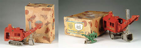 LOT OF TWO STEAM SHOVELS ONE W/OB. 1) Large Panama steam shovel enameled red and embossed “PANAMA” in gold highlights with nickel-plated treads and shovel. In original box with box label “NO. 736 STEAM SHOVEL, 1 IN BOX”. Also with original “Hubley” decal on top. SIZE: 9” l. CONDITION: Near mint in all original condition. Box in good condition. 2) Tiny green steam shovel with nickel-plated wheels and shovel. SIZE: 3” h. CONDITION: Very good. MC 1-3880 & 1-3979 (1,400-1,600) Auction: Advertising, Toy & Doll - Spring 2005 Please Note: All prices include the hammer price plus the buyer’s premium, which is paid by the buyer as part of the purchase price. The prices noted here after the auction are considered unofficial and do not become official until after the 46th day. |