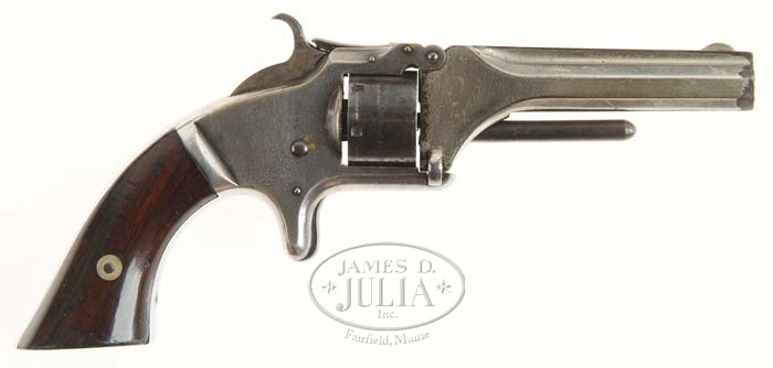 RARE SMITH & WESSON TRI-TONE MODEL 1 SECOND ISSUE SPUR TRIGGER REVOLVER. Cal. 22 Short. SN 70648. Tri-tone finish, 3-3/16” keyhole bbl, half moon front sight, rosewood grips. Frame is silver plated, cylinder is blue & bbl is nickel finish making it one of the more rare second issue Smiths. CONDITION: Very fine. Bbl retains about 70% orig nickel, cylinder retains 75-80% thin orig blue & frame retains 97-98% orig silver with some light pimpling on right side of frame. Grips show moderate wear on edges & retain about 85% orig varnish. Mechanic are fine, worn dark bore. 4-58116 ET105 (600-1,000)