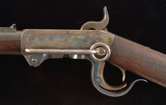 BURNSIDE MODEL 1864 CIVIL WAR CARBINE. Cal. 54. SN 6784 21” rnd bbl. Walnut stock. Blue and casehardened finish. Standard markings on bbl, receiver and lockplate. Last variation with screw in right side of action to guide the breechblock. CONDITION: Very fine, with 80% thinning blue on bbl, bright blue on breechblock lever and upper tang, brilliant casehardening on left side of receiver, fading on lock and buttplate. Butt has been cleaned and re-oiled with some bruises and scratches remaining. Bore is bright. Action is fine. 4-30325 FS40 (4,000-5,000)