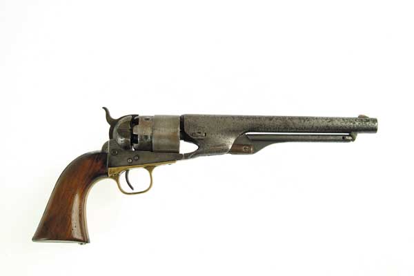 ASSEMBLED COLT MODEL 1860 ARMY REVOLVER. Cal .44. 8” round bbl. It has parts from at least four different guns. All numbers match including the cylinder from an Italian replica. SN 157184. CONDITION: Gray patina with pitting and file marks. Grips are loose but do not show much wear. Four nipples and some internal parts are missing. 4-49032 X50 (400-600)