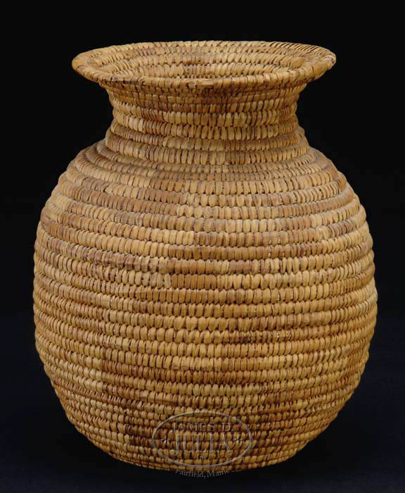 UNUSUAL AND EARLY PAPAGO OLLA COILED BASKET. Light brown decoration. SIZE: 9-1/2”h x 8” dia. CONDITION: Very good. 9-73425 (200-300)