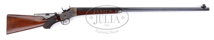 REMINGTON ROLLING BLOCK LONG RANGE TARGET RIFLE. SN 3757. Cal. 44 S (Probably 44-77 Sharps/Remington). Fine target rifle with 34″ oct to rnd bbl, Wingage Spirit Level front sight, no provision for a rear sight and is mounted with a vernier tang sight with 4-3/4″ staff. Mounted with moderately figured American walnut with steel Schnabel tipped uncheckered forearm and checkered serpentine pistol grip stock with black insert and smooth steel buttplate. There is a “B26” stamped on right flat of bbl. PROVENANCE: Glenn Marsh Collection CONDITION: Fine. Bbl retains about 85% strong orig blue with loss areas flaked to a light patina with some fine pitting in those areas. Receiver retains virtually all of its orig case colors, strong & bright on sides, moderately faded on top & bottom. Wood is sound with light nicks, dings & scratches and retains most of its orig oil finish. Mechanics are crisp, brilliant shiny bore. 4-59718 JR10 (4,000-7,000)