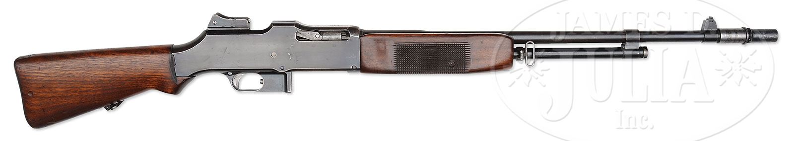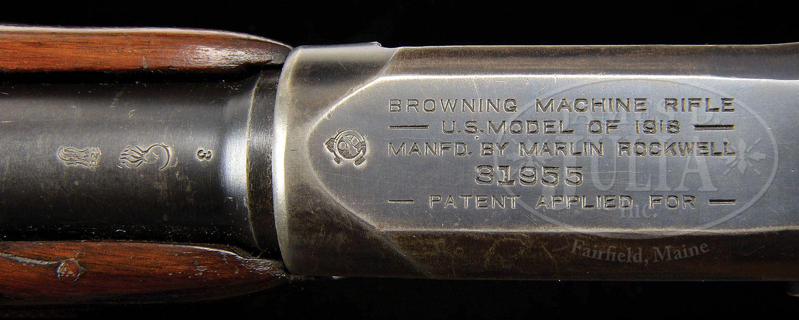 **MARLIN-ROCKWELL 1918 BAR (C & R). SN 31955. Cal. 30-06. Bbl length is 24″. This is an extremely attractive example of the 1918 Browning Automatic Rifle as manufactured by Marlin Rockwell. Bbl is dated “8-18” with flaming bomb arsenal mark below a “W”. Rear of bbl also has flaming bomb proof mark. Front of receiver just to rear of bbl has crossed cannons proof mark. Bipod and flash hider are included however no magazine is present. This weapon has correct early style gas port nut. Also has correct checkered wooden forend. This weapon appears to be of all orig vintage parts with the exception of the bipod and flash hider. Firing mechanism operates smoothly when operated by hand. This weapon appears functional. PROVENANCE: Collection of Carl “Bill” Morrison. CONDITION: Overall finish and appearance is fine with about 50% coverage of finish to metal parts due to thinning and patina on bbl and receiver. Gas tube and bipod legs have a deeper more charcoal color finish. Buttstock and forearm have some handling marks. The forend has a repaired crack about 1/4″ down from the left side running 10″ longitudinally parallel to the upper edge. There is also evidence of some previous charring of the wood due to excessive heat from the bbl. There is also a repaired chip in the forend on the left side about 1/2″ long about 2″ forward of the receiver. Forend and buttstock have been refinished. Bore is in need of a cleaning and dark in the grooves. Bolt and receiver also need a cleaning but bolt face seems extremely fine underneath the grime. This is a great example of an early Browning Automatic Rifle. 4-48668 JWK25 (17,500-27,500)