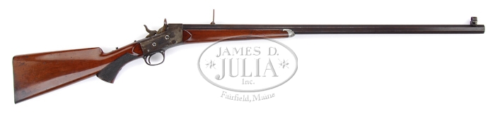 WHITNEY-LAIDLEY LARGE FRAME DELUXE ROLLING BLOCK TARGET RIFLE. SN 591. Cal. 44-90. Fine early rifle with 32″ oct bbl, Wingage globe front sight and tiny ladder rear sight. Top tang was drilled & tapped for tang sight with only the screws remaining. Mounted with nicely figured American walnut with uncheckered, pewter tipped forearm and checkered pistol grip stock with smooth steel buttplate. PROVENANCE: Glenn Marsh Collection CONDITION: Fine to very fine. Bbl retains 85-90% orig blue turning brown. Receiver retains 60-70% orig case colors, strong on left side, more faded on right side, top & bottom. Wood is sound with light handling & use marks and retains most of its orig factory varnish finish. Mechanics are fine, brilliant shiny bore. 4-59519 JR17 (4,000-7,000)