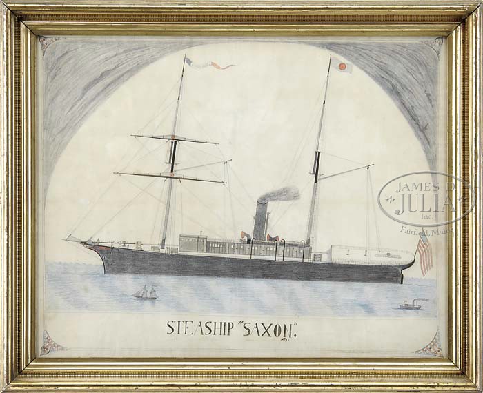 OUTSTANDING PRIMITIVE DRAWING OF THE STEAMSHIP “SAXON”. The drawing, circa 1875, in pencil, colored pencil, and ink on paper. Signed John Bottier, Seaman. The drawing showing the two-mast central stack black hulled ship sailing right to left with American flag off stern, the ship’s pennant off the front mast. The ship is shown on blue water with two very small boats in the foreground. The bottom with a penned title, also “Boston & Philadelphia Steamship Line”. This company was founded in 1852. The picture is self framed with wonderful red, white, and blue decorated corners and shaded corner areas at top. Housed in a period lemon gold molded wood frame with glass. SIZE: Sight: 21-1/4″ x 27-1/4″. CONDITION: Some light foxing, very good. 9-22911 (2,000-3,000)