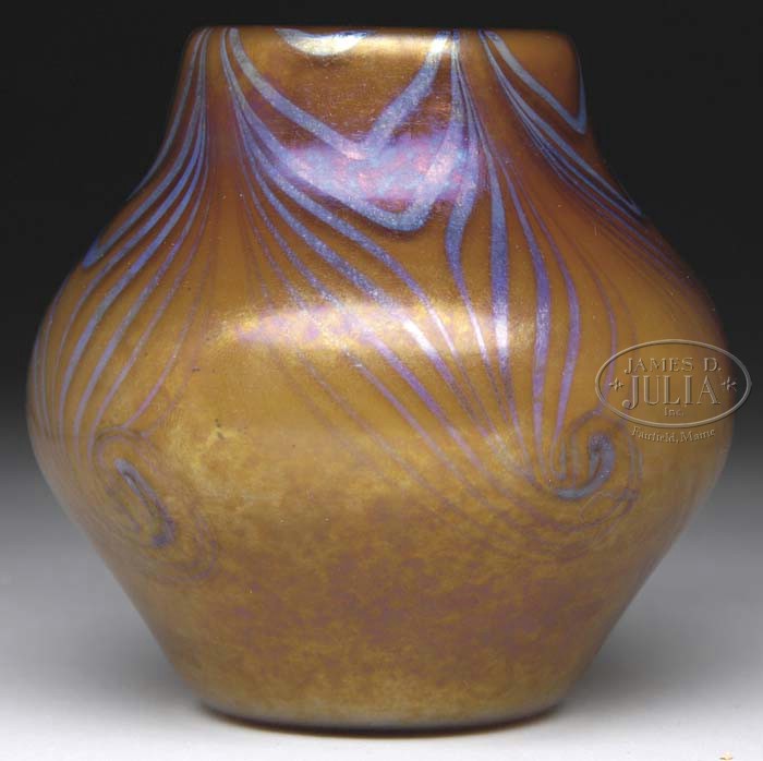 STEUBEN BROWN AURENE DECORATED VASE. Very nice Steuben vase has brown aurene body and is decorated with a blue iridescent hooked feather design descending from the lip. Marked on the underside “Aurene 649”. SIZE: 3-1/4″ t. CONDITION: Very good to excellent. 5-63736 (800-1,200)